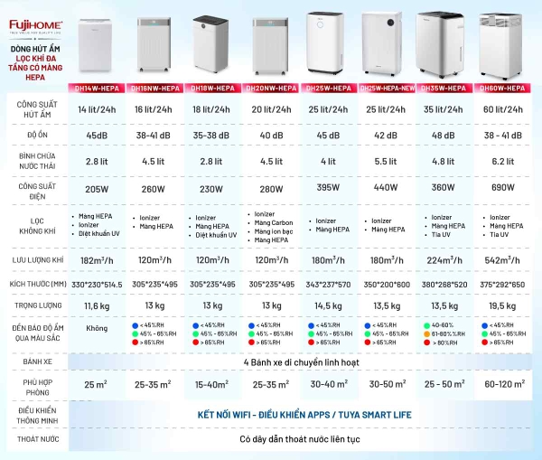 Trong nỗ lực nâng cao chất lượng sống và bảo vệ sức khỏe người tiêu dùng Việt, Fujihome đã chính thức hoàn thiện hệ sinh thái máy hút ẩm tích hợp màng lọc HEPA cao cấp. Với 6 model đa dạng công suất từ 14L đến 60L/ngày, Fujihome mang đến giải pháp toàn diện cho mọi không gian từ căn hộ nhỏ, biệt thự cho đến văn phòng, showroom.